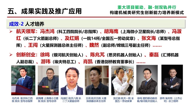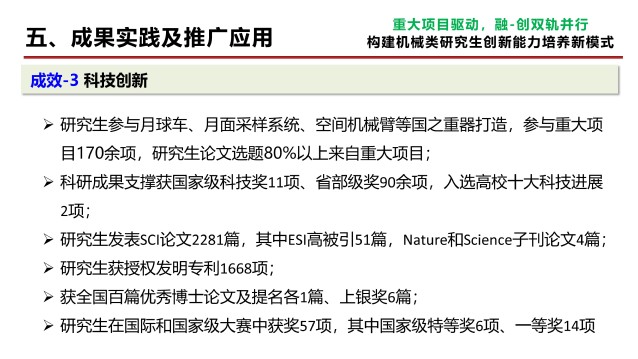 在邓宗全院士、刘宏院士主导下,机械工程学科紧密围绕航天与国防重点领域,发挥产学研协同优势,系统实施了“重大项目驱动、融-促双轨并行”的教学改革措施,构建了机械类研究生创新能力培养新模式: