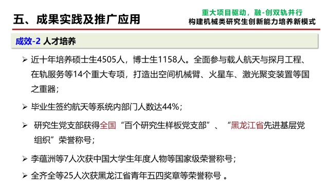 4)培养资源持续拓展,获批国家级联合培养示范基地和工信部协同育人示范基地,教师团队入选全国教育系统先进集体、全国高校黄大年式教师团队等,教学成果获国家学位与研究生教育二等奖1项,省一等奖2项、二等奖2项。