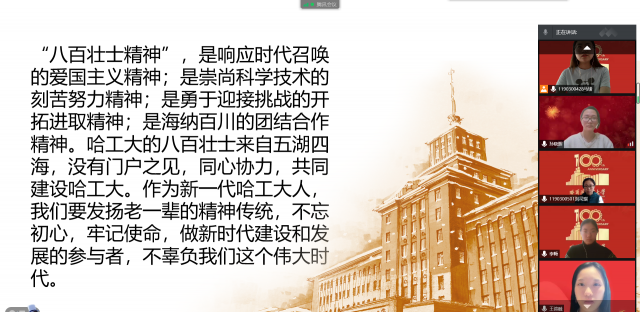 首先,主持人马珺同学为大家播放了有关哈工大“八百壮士”历史的纪录片,王锦融同学带领组员回顾了“八百壮士”的形成与发展。其次,李畅、马珺同学选取了哈工大“八百壮士”中几位杰出代表的事迹为大家介绍,并播放了相关纪录片。接下来,孙晓晖同学带领组员在“八百壮士”的事迹中探索分析哈工大“八百壮士”精神的真谛。最后,刘司琪同学结合习近平总书记贺信和大家一起探讨如何继承与发扬哈工大“八百壮士”精神。团队成员在活动结束后进行了线上研讨,交流心得体会。