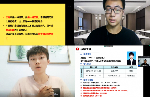 薪火相传一百年,对话优秀机电人。为全面落实习近平总书记对榜样学习的重要指示,学习习近平总书记贺信精神,传承和发扬一代代工大人精神,MK体育启动了“对话机电人”系列采访活动。7月10日,MK体育员工会邀请到了优秀博士毕业生孙猛猛以及优秀硕士毕业生林能旭接受采访,以期为同学们指点迷津,本次会议采用云采访的形式,由张紫涵主持。