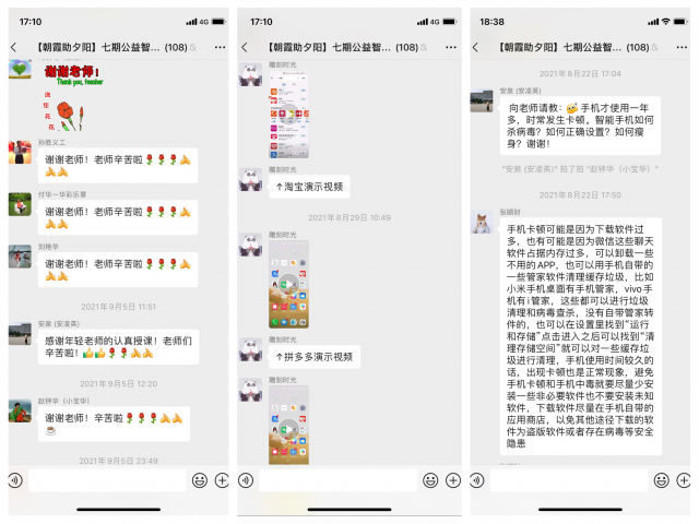 学员沈桂华老人说“非常感谢各位老师能提供给我们这些老年人这样一个学习平台,虽然课程中的很多东西我之前有些了解,但通过这期课程,我学到了更多非常实用非常方便的专业细节和使用技巧”。相信,通过志愿者的努力,更多老年人将学会如何驾驭智能手机,不断提升老年人在高科技信息社会的获得感,幸福感,安全感和成就感,彻底跨越数字鸿沟。