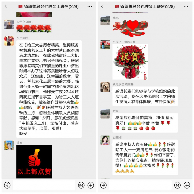 本次主题晚会获得了老人们和孙胜会长的高度评价,王跃老人会后表示:“青春的气息,敬老的感动,朝阳蓬勃,夕阳更红,感谢为演出辛苦奉献的每一个人为我们带来精神享受。”老人们充满幸福的笑容是每一个志愿者收到的最大的回报,也是志愿者们继续前行传播温暖与祝福的动力源泉。相信通过不断开展同类型的敬老助老活动,满怀热情传播爱心,就能让更多的人加入敬老助老的活动中去,社会共同努力,让老年人的晚年生活更有意义,更有乐趣,更加丰富多彩。