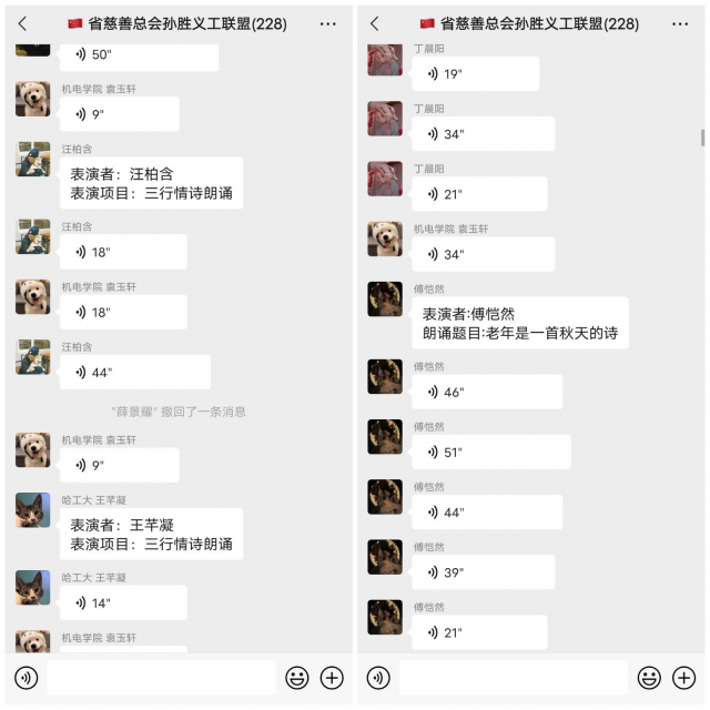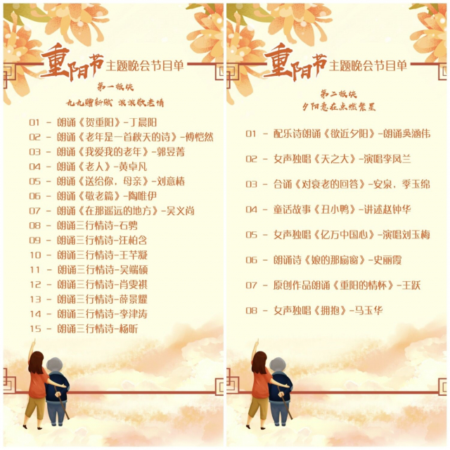本次主题晚会,主要分为两大板块。第一个板块,“九九赠新赋,浓浓敬老情”,由志愿者们深情地朗诵敬老主题诗歌作品和三行情诗,表达着他们对老人们昔年青春岁月的奉献和付出的崇敬。青年志愿者说:“如果说我们是八九点钟的太阳,充满希望,那老年人是硕果累累的秋天,充满智慧和超脱。”《老年是秋天的一首诗》《贺重阳》《在那遥远的地方》都表达出老年人如大海般深沉博大的淡泊超脱,乐观豁达。十多首诗歌和情诗,不仅寄托着同学们对老人们青春岁月的奉献和付出的崇敬,也抒发着对老人们的祝福、感恩与赞美。第二板块“夕阳意在点燃繁星”,八位老师各自通过诗乐朗诵、歌唱、讲述故事等多种方式,用作品发声,以行动来感恩生活。