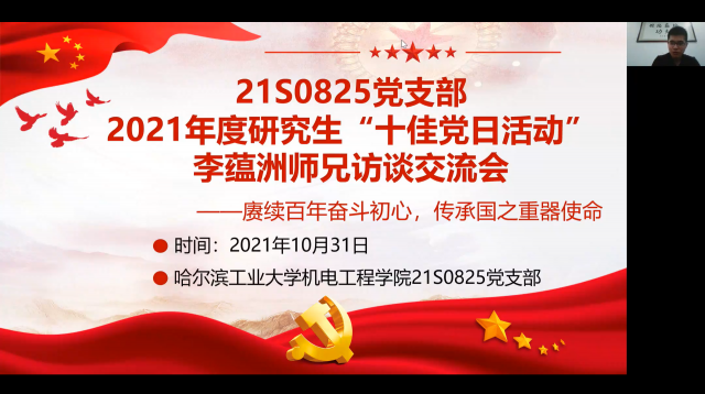 为深入学习习近平新时代中国特色社会主义思想和“七一”重要讲话精神,MK体育21S0825党支部开展“赓续百年奋斗初心,传承国之重器使命”主题党日活动,重点研究一代代哈工大人如何围绕国家重大需求而接续奋斗,探索其所继承的初心和使命,引导党员坚定理想信念,牢记前辈初心,以青春之我奉献青春之中国。10月31日上午9点30分,党支部邀请到Mksport体育机器人研究所优秀员工代表李蕴洲同志与支部成员进行访谈交流,活动在腾讯会议以线上方式进行,由党支部书记刘云同志进行主持。