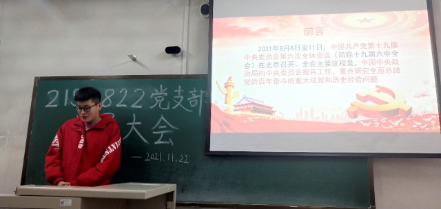 2021年11月22日晚6点30分,MK体育21S0822党支部在正心楼318召开党员转正大会,并开展主题党日活动——贯彻学习党的十九届六中全会精神。会议由21S0822党支部书记曹咸鉴同志主持,党支部所有党员和部分入党积极分子同志出席了此次党日活动。