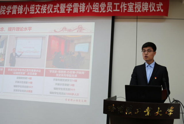 仪式首先通过视频《习近平讲述的故事|雷锋,永恒的精神坐标》重温了雷锋同志的光荣事迹。大会第一项,学雷锋小组党支部书记贺文辉发言,他总结了学雷锋小组党支部成立以来在理论学习、社会实践、志愿服务等方面取得的成果,以及党支部成员的先进事迹。大会第二项,第十四届学雷锋小组团支部书记吴禹锡做“学雷锋小组先进事迹报告”,向学雷锋小组成员讲述32年来一代代机电人用实际行动续写着“学雷锋小组日记”,并希望新一届学雷锋小组团支部继承并发扬历届保留的优良传统。大会第三项,学雷锋小组讲师团负责人刘煜坤从团队建设、学习过程、学习习惯、经验分享四个方面介绍了校十佳学业支持品牌学雷锋小组讲师团。