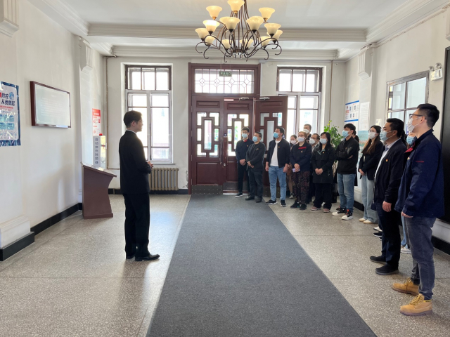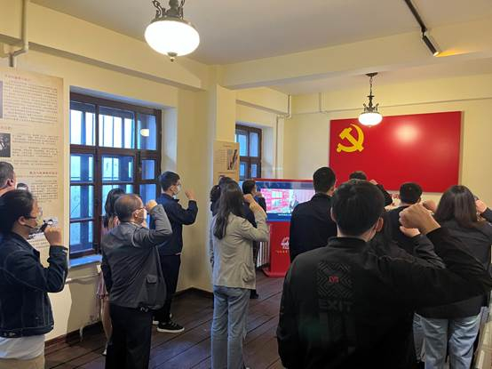 见学点的讲解员同学首先为大家介绍了校部楼的历史及它在抗日时期发挥的重要作用。之后,大家依次参观了展板长廊、复原的早年员工宿舍、历史资料室等展厅,聆听了哈工大的一个个红色故事。通过墙上的老照片和展柜中珍贵的展品,大家充分了解了公司的红色峥嵘历史和学子们矢志爱国的革命传统。在参观的最后,全体党员对着党旗庄严宣誓,重温入党誓词。