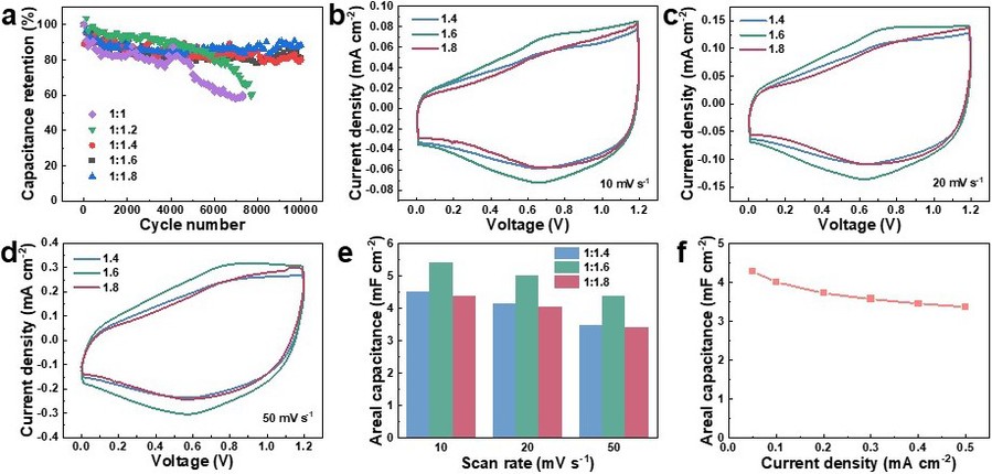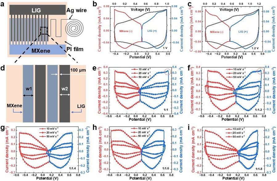 针对上述问题,团队基于激光技术的灵活性,通过皮秒紫外激光精细刻蚀和激光直写技术,在聚酰亚胺薄膜基底上制备了非对称微型超级电容器,提出用变指宽策略对正负极电容进行调控,通过循环伏安原位探测和电化学性能对比确定最佳叉指线宽比,实现了正负极电容的高精度匹配。通过该方法制备的非对称超级电容器获得了1.2伏的工作电压窗口,高精度匹配后的能量密度提升到匹配前的1.9倍。该研究中非对称电极制备和容量匹配策略为平面非对称超级电容器的研究提供了新视角。