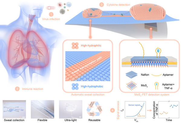 针对这一难题,潘昀路教授团队研制了具备汗液自动输送能力的纳米结构阵列,再采用全氟磺酸树脂/适配体修饰的二硫化钼场效应管作为敏感元件,构建了一种可重复使用传感器,具有图案化润湿性的纳米结构阵列可自动收集汗液,并阻止杂质污染检测区。该装置可直接检测未稀释汗液中的 肿瘤坏死因子-α蛋白,检测范围低至10-14摩尔级别。超薄、超柔性基底的使用确保了稳定的电气性能,即使在发生多次剧烈变形后也是如此。研究结果表明,该设备有可能通过汗液检测对患者的免疫状态进行实时评估和管理。